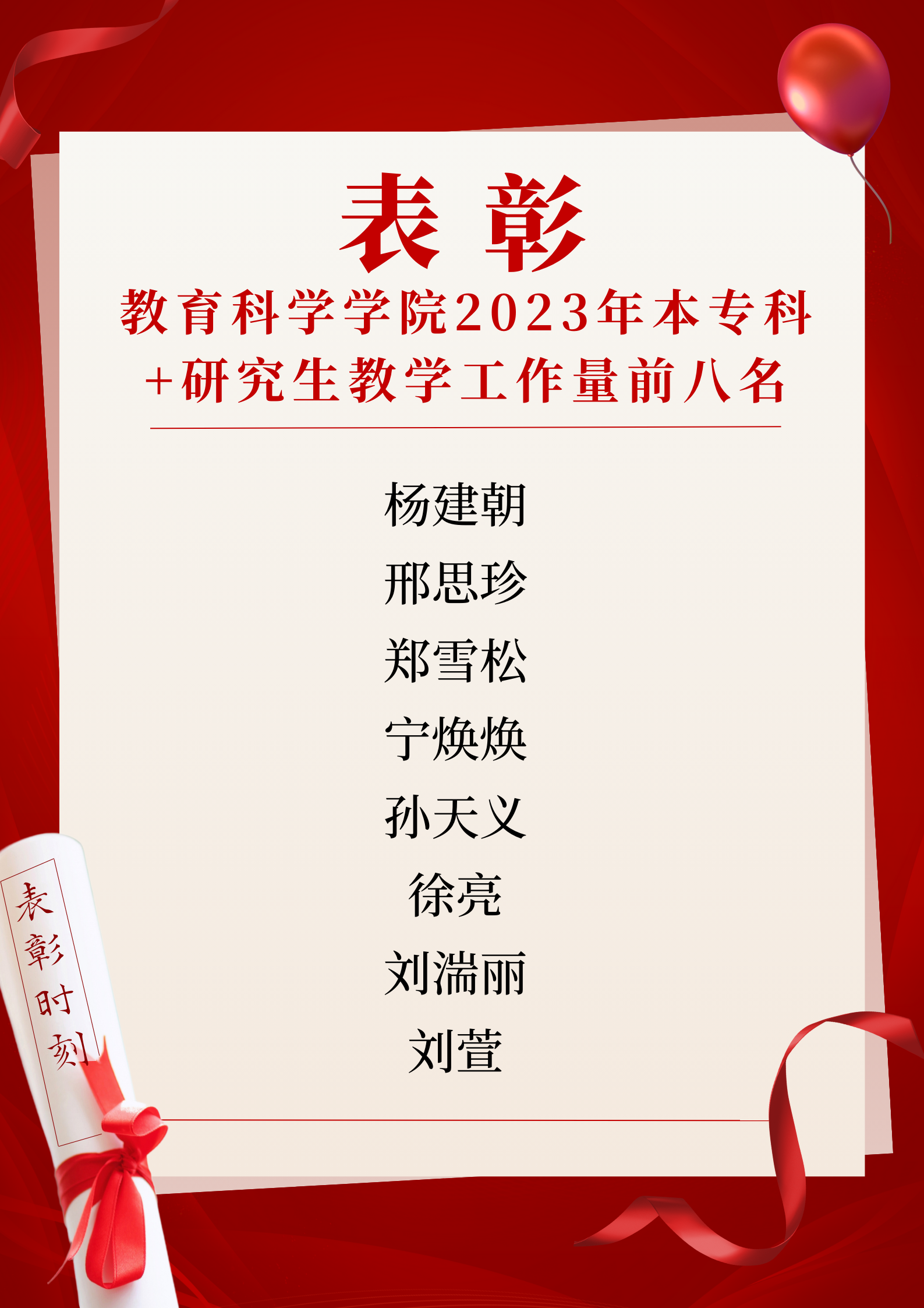 【表彰】太阳成集团122ccvip2023年本专科+研究生教学工作量前八名