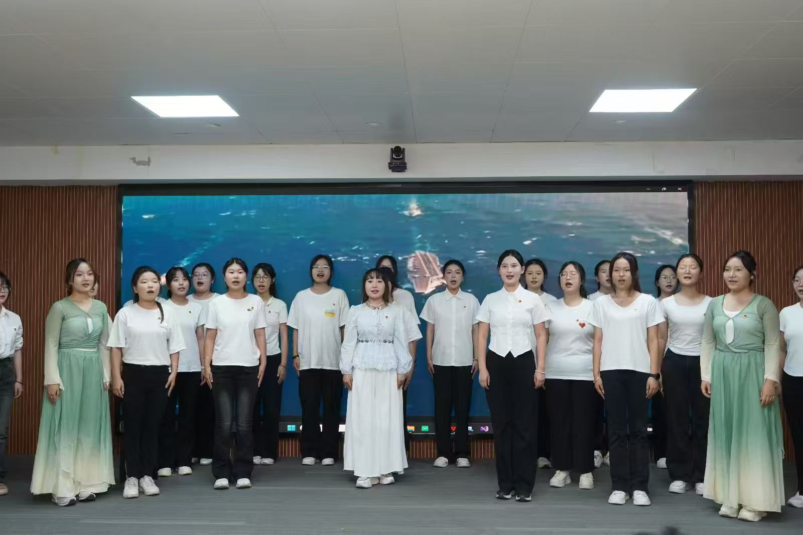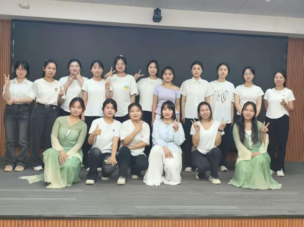 筹备阶段,同学们热情高涨,每天课余准时到排练室,全身心投入排练。同学们利用课间诵读歌词,为了让歌词更具感染力,她们反复琢磨咬字与音调;练习手势舞时,大家对着镜子不断纠正动作,力求每个手势都精准到位;编排舞蹈动作时,团体成员集思广益,不断调整,确保舞蹈与歌曲情感完美契合。从站位高低错落到动态走位的变换,队形方案多次调整,力求用歌声传递对共青团的热爱与敬意。