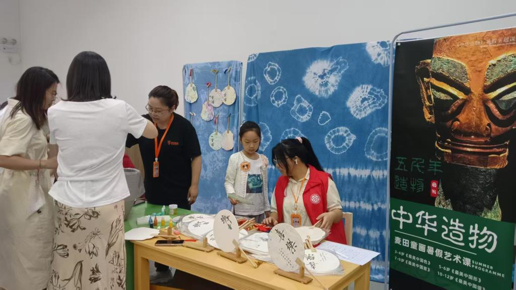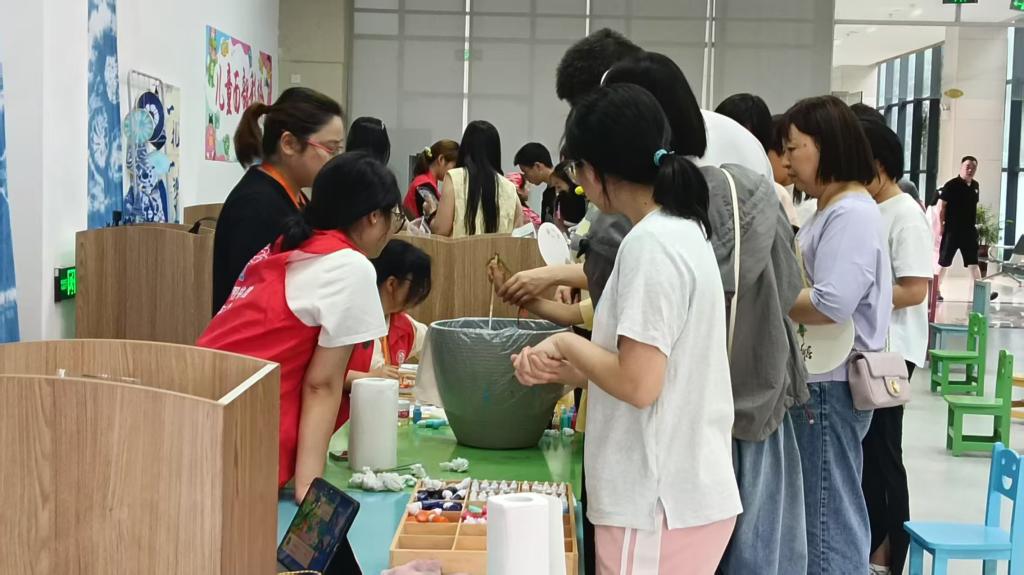 高校赋能,非遗体验走进童趣空间。在图书馆一楼花园的“古韵新风”小院雅集中,教科院组织专业师生团队开展四大传统文化体验项目。面部彩绘区,孩子们化身“小粽子”“龙舟小将”;扎染台前,在志愿者指导下完成的蓝白纹样布包成为热门“伴手礼”;漂漆扇体验区,非遗技艺与儿童创意碰撞出抽象图案;香包制作区则弥漫着艾草清香,孩子们亲手缝制的香囊成为端午记忆的载体。