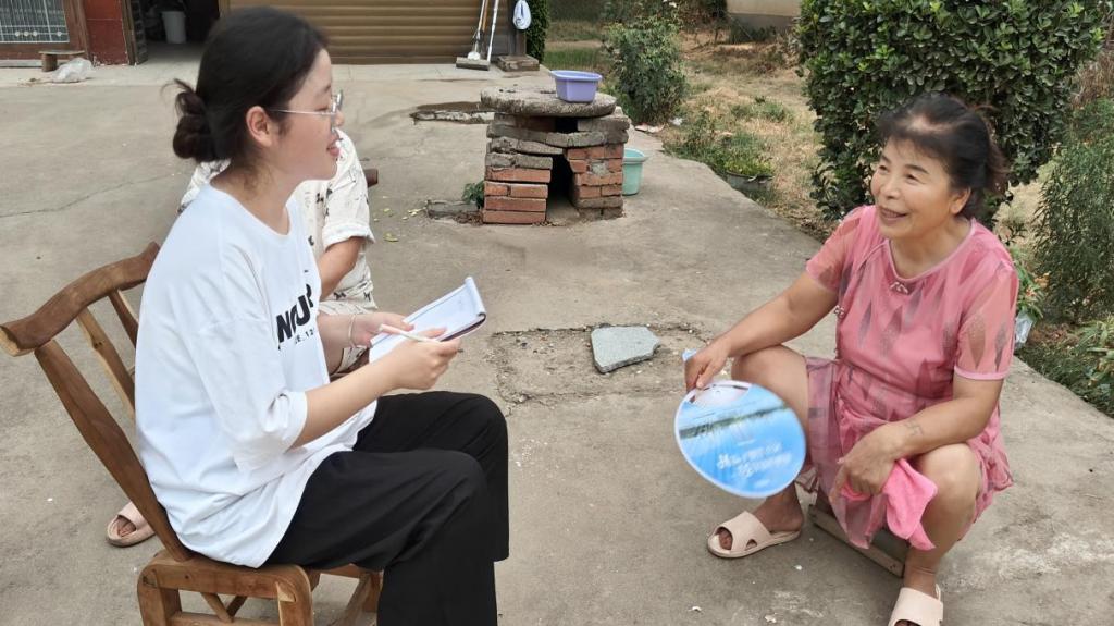 走进村民家中,与王大娘聊聊普通话,在唠家常中让村民认识到推普的重要性,同时了解村民的日常生活中普通话使用难处。田埂上的劳作间隙,也成了最热闹的推普课堂。李大叔拿着农药说明书犯愁,队员凑过去用普通话逐句念:“这款农药稀释比例是1比500,喷洒时要避开正午高温。”念完又用方言再解释一遍,还教李大叔念“稀释”“比例”这些关键词。“原来这么念!之前跟技术员打电话,俺说‘兑稀点’,人家半天没懂啥意思!”李大叔摸着后脑勺笑,跟着队员一遍遍练习。