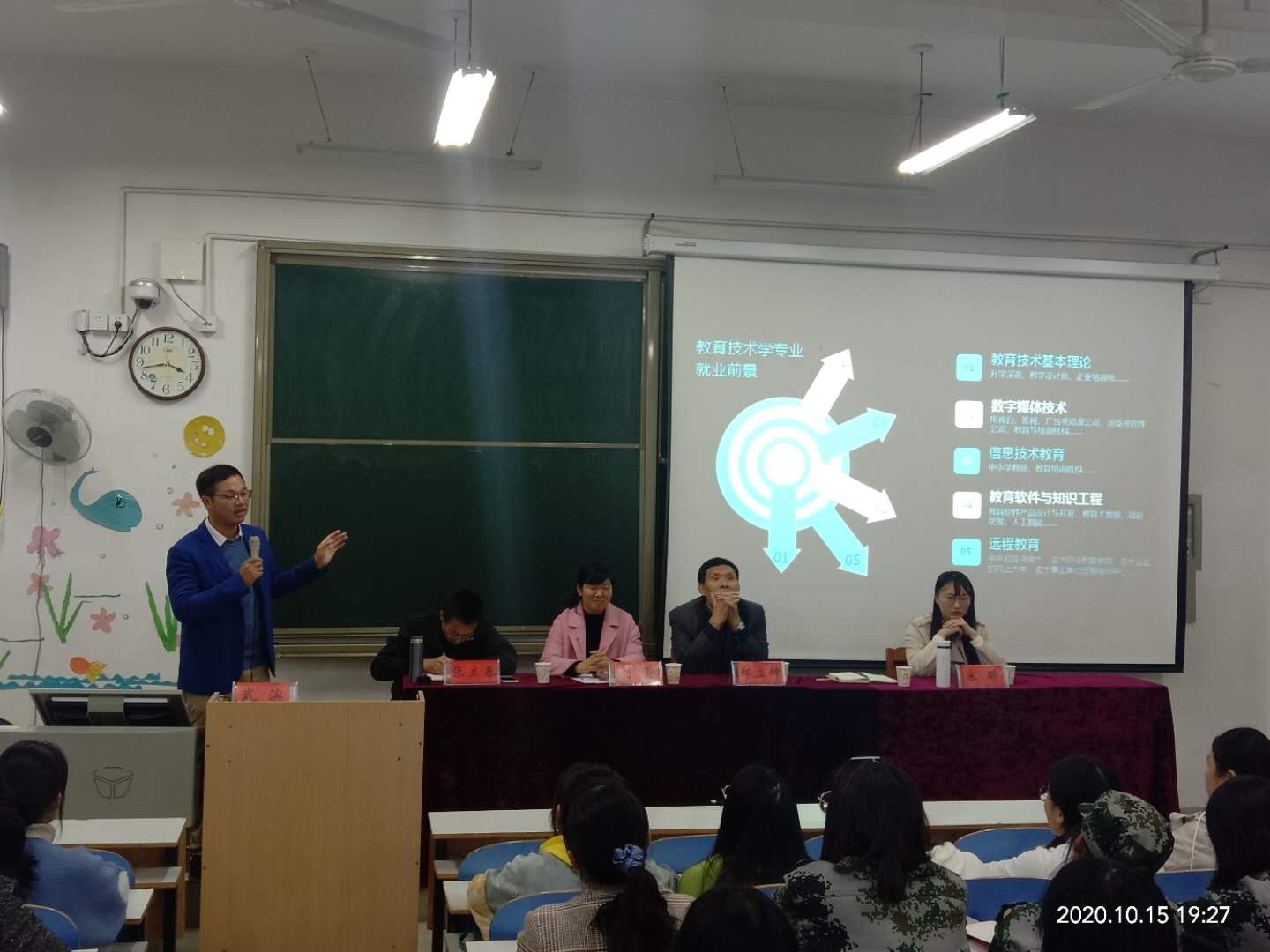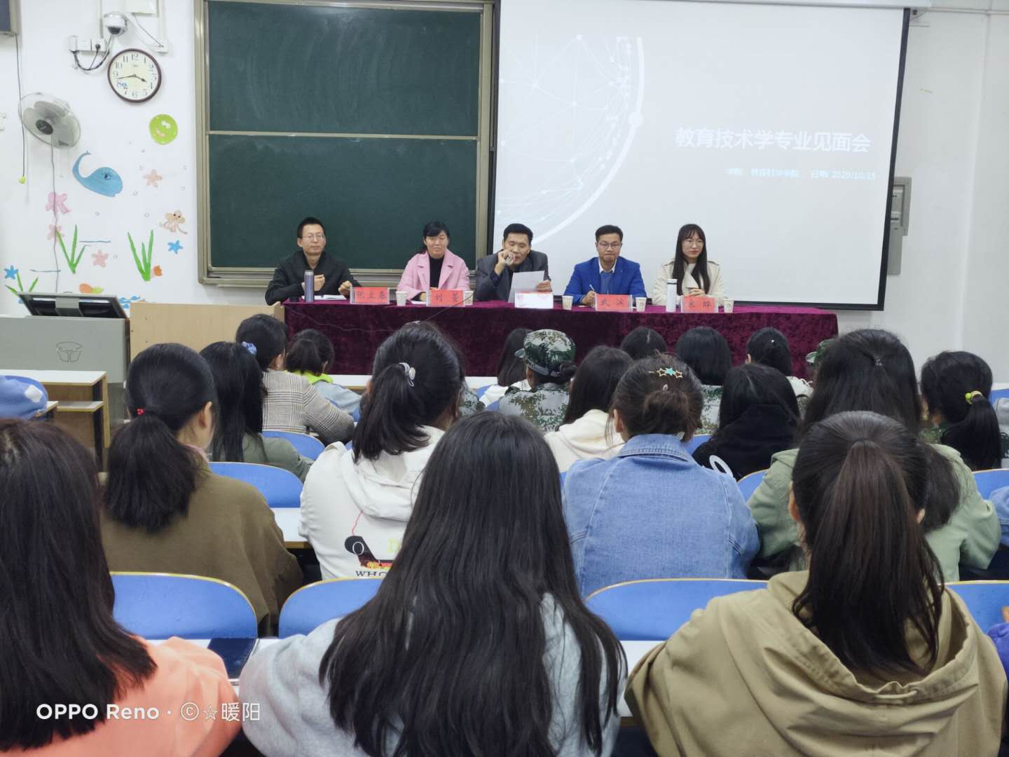 时间:2020-10-16 10:20:15 来源: 作者: 阅读: 次2020年10月15日,信阳师范公司教科院2020级教育技术学班导师见面会在教科楼201教室举行。郑立坤教授 ,刘萱老师,武滨博士 ,宋晔老师,张立春老师参加此次见面会。郑立坤教授首先对教育技术学的简介及发展背景进行了详细的介绍,让新生对自己所学的专业有所了解。刘萱老师将专业培养方案及专业课程向新生进行了讲解,并且列举出很多教育技术学往届优秀的毕业生,让员工真正感受到这个专业的优势和可观的发展。武滨博士就员工比较关心的就业前景进行了细致地解答,将教育技术学专业多元化多领域的就业方向通过形象生动的语言展现给员工。宋晔老师结合自身的学习和经历用,实际例子讲述了教育技术学的就业发展,并且总结了自己上学的经验,给员工留下深刻影响。最后,张立春老师对几位老师的发言进行了详细总结,并且作为2020级教育技术学班的班主任,张立春老师嘱托同学一定要结合自身的情况学会如何去高效率学习,做到一专多能!
