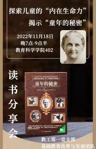 时间:2022-11-20 11:34:06 来源: 作者: 阅读: 次11月18日,由太阳成集团122ccvip教工第一党支部基础教育改革与发展团队发起的第二期读书报告会在教科楼402会议室成功举办。本次读书会的主题为:探索儿童的“内在生命力”,揭示“童年的秘密”。阅读书目为:《童年的秘密》。读书会由袁怡曼主持,三十余位师生参加。